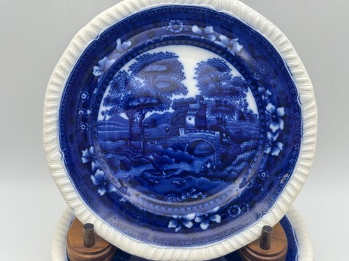 These bread / appetizer plates measure 6 3/8" in diameter and are in overall very good estate condition. One of the plates has a small chip on the rim (see picture). These plates have a flow blue finish. They have the old Spode mark.