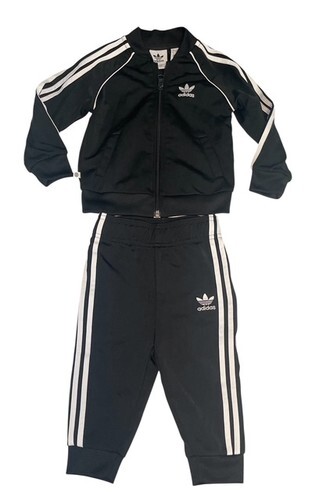 Authentic Adidas baby track suit, classic black with white 3-stripe design.