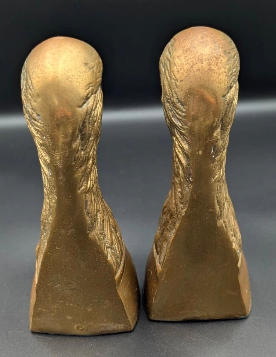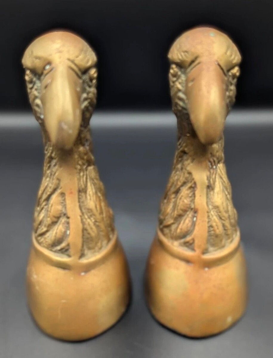 A striking pair of vintage brass eagle bookends, featuring beautifully sculpted heads with strong classical presence and rich aged patina.