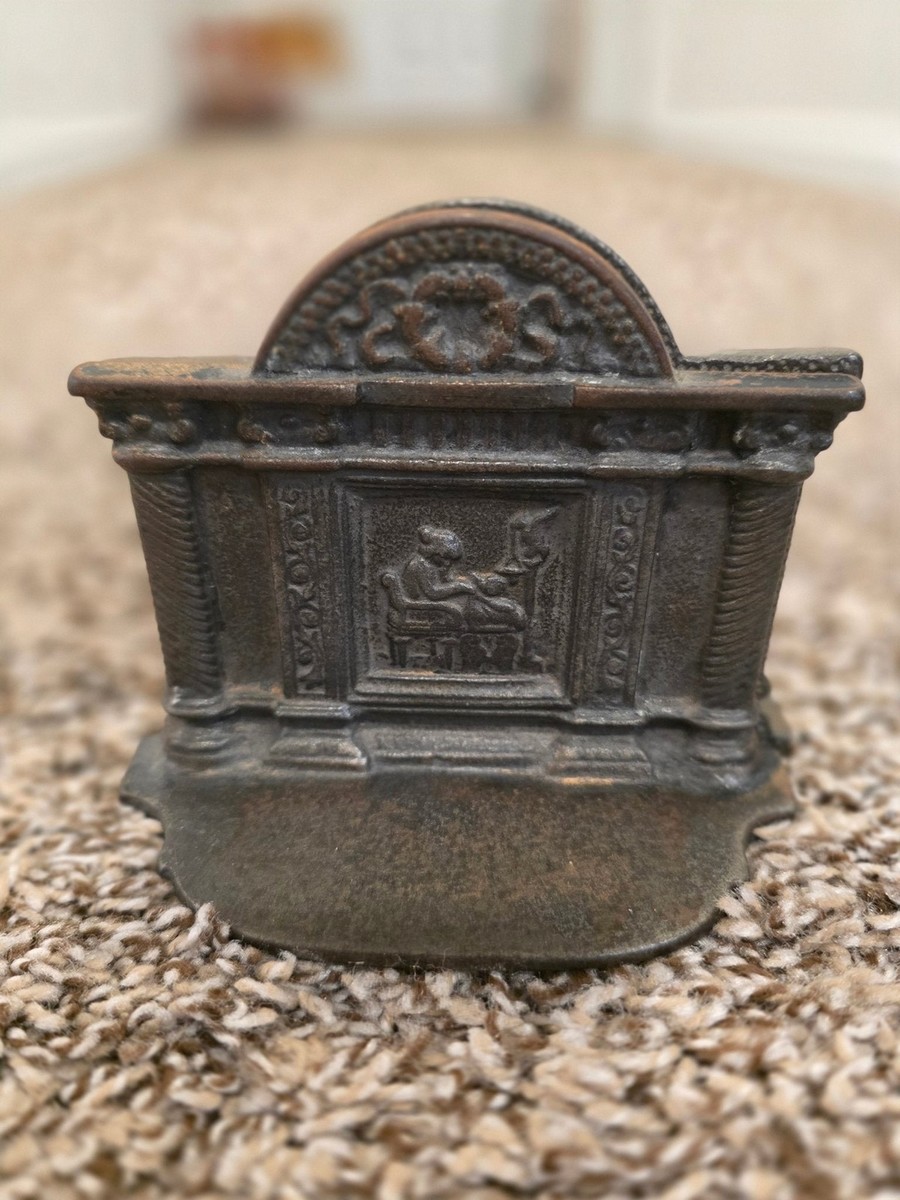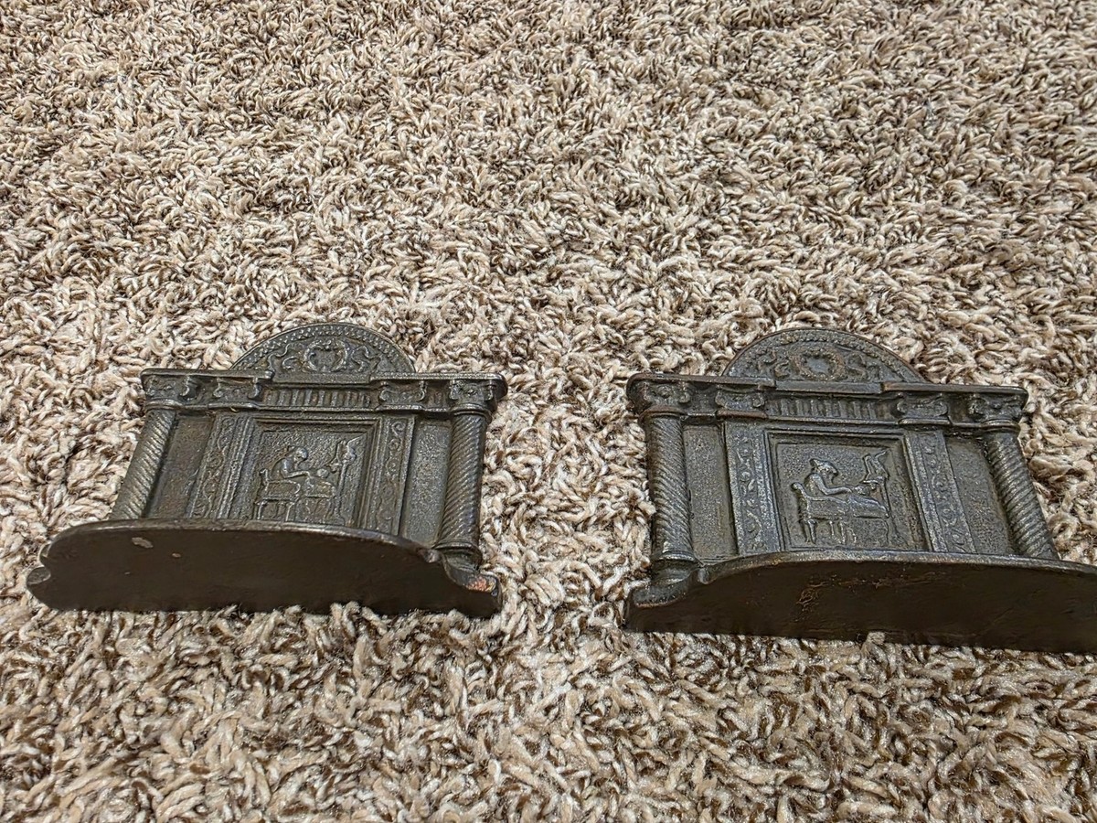 These bookends evoke an Old World library aesthetic, with a timeless presence that blends historical influence and decorative craftsmanship. The raised scene detailing and heavy cast construction give them both visual depth and functional weight, making them ideal for supporting books or elevating a curated shelf or desk.