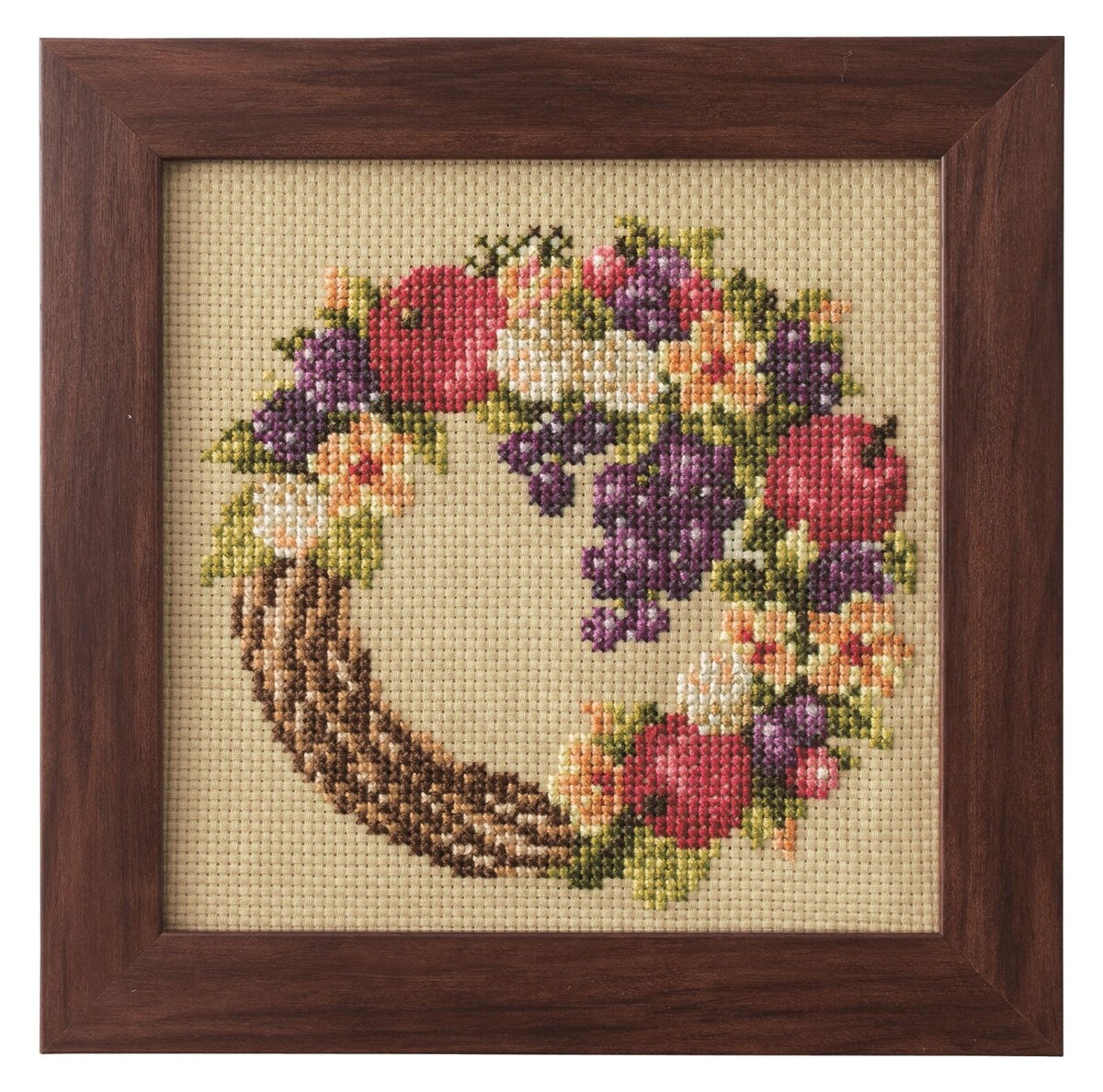 Cosmo Harvest Wreath Seasonal Flower Arrangement Cross Stitch Kit. This cross stitch kit comes with everything you need to make the beautiful seasonal floral project. October: Harvest Wreath. Kit Includes: COSMO Embroidery Floss (100 percent cotton), 1m each, COSMO Embroidery Cloth (100 percent cotton), Embroidery Needle, Square Wooden Frame 6.75 inches x 6.75 inches, Instruction Manual with Design Chart. Frame Size: Approximately 6-3/4 inches x 6-3/4 inches. Difficulty Level: Intermediate. No. 592310. CHK-592310
