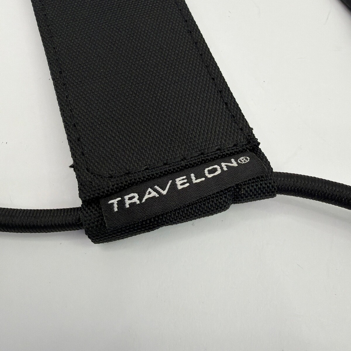 Travelon Bag Bungee luggage strap (model 12181-50 / CH70) in black. Pre-owned and appears clean with light signs of handling; no major flaws noticed. Includes the strap shown (with the attached clear pocket/instruction card).