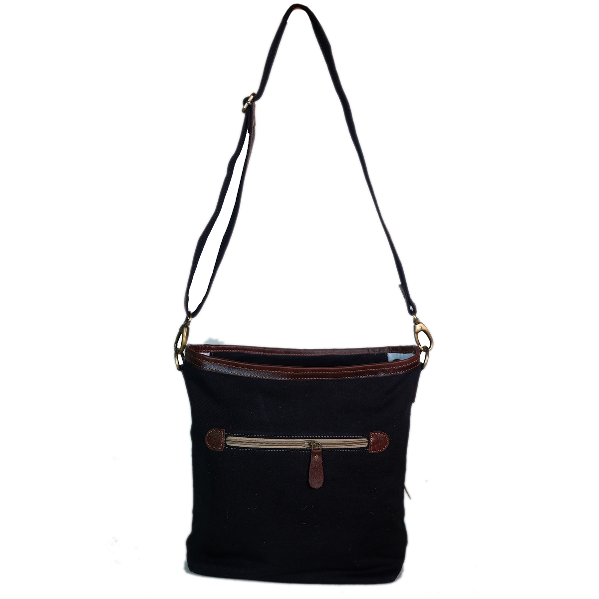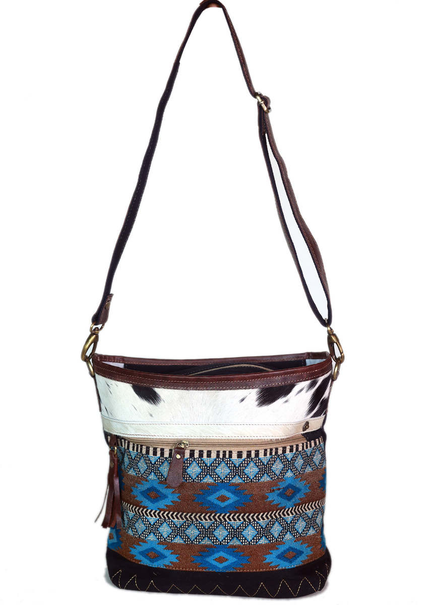Challenger women's handbag made from upcycled canvas and full-grain leather accents. Shoulder bag features a turquoise, and brown aztec design, with cowhide accents. This practical, lightweight, and conveniently sized roomy bag is made sturdy to endure everyday use. Includes a removable shoulder strap. Perfect choice for school, work, or travel. Main compartment has a full zipper closure with a wide opening to easily access your belongings. The fully lined interior also features a side zippered pocket, and two open pockets for additional storage. There are also zippered pocket at the front, and back of bag to store easily reachable items. The antique finish brass hardware beautifully ties the bag together. Bag measures 13.5" L x 12.5" H providing plenty of room for all of your everyday essentials.