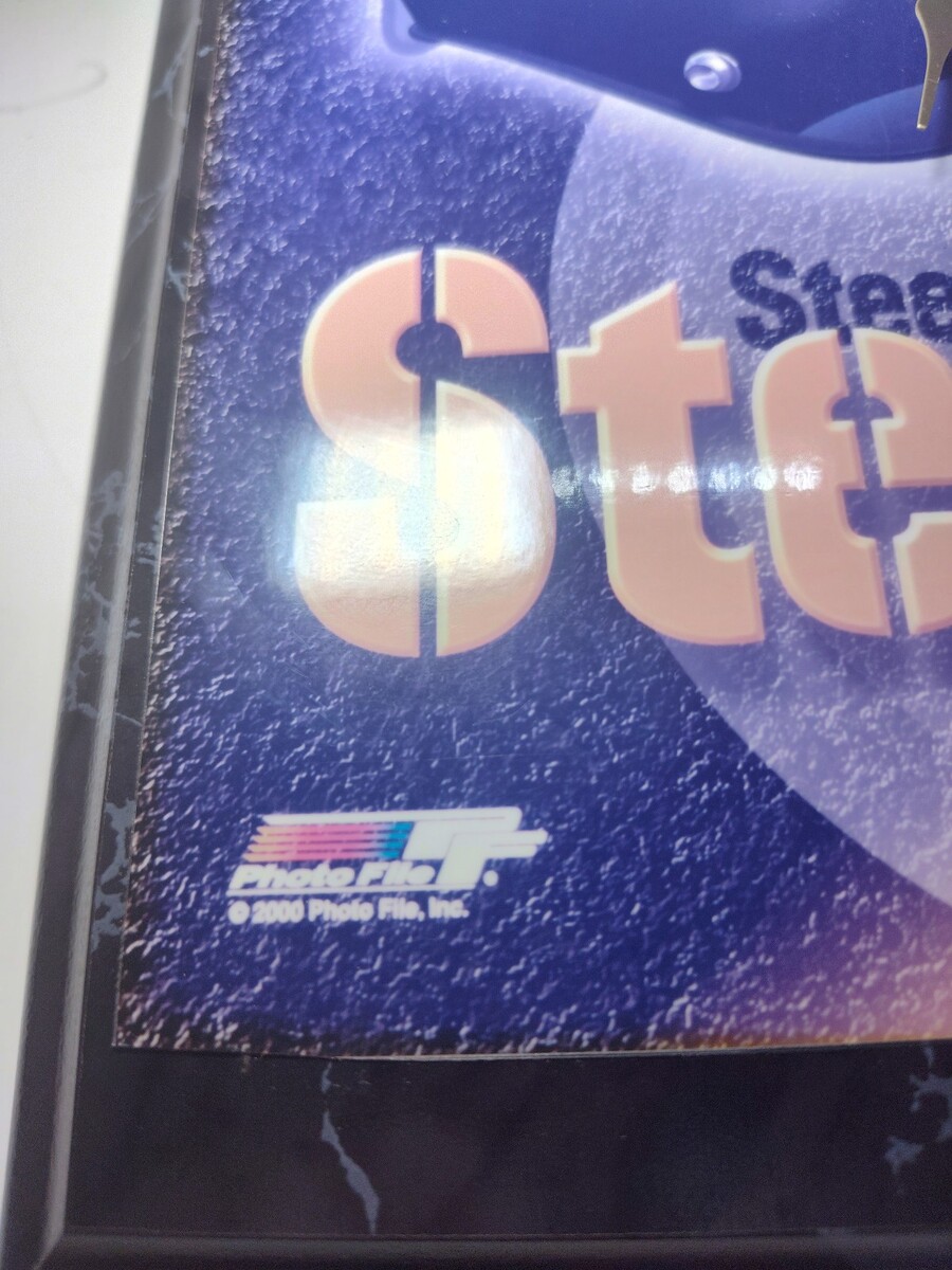 Vintage Pittsburgh Steelers framed wall clock featuring helmet artwork by Photo File Inc. (2000). Officially licensed NFL product with hologram authentication on the front.