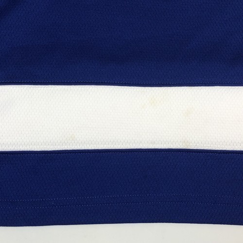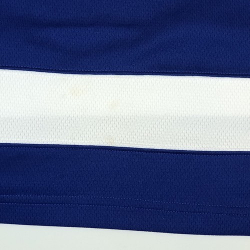Has some light marks on the front bottom white trim and the back of the right sleeve.