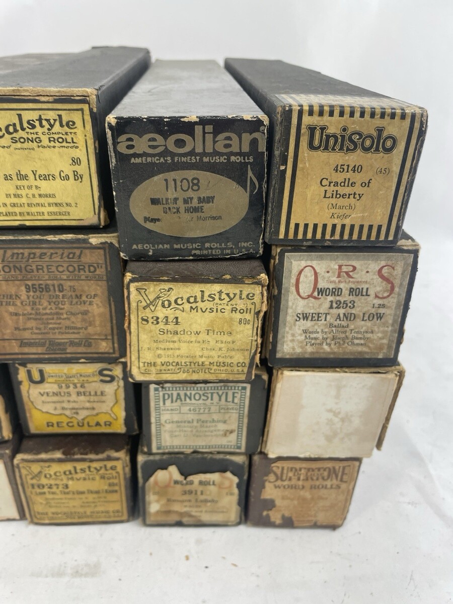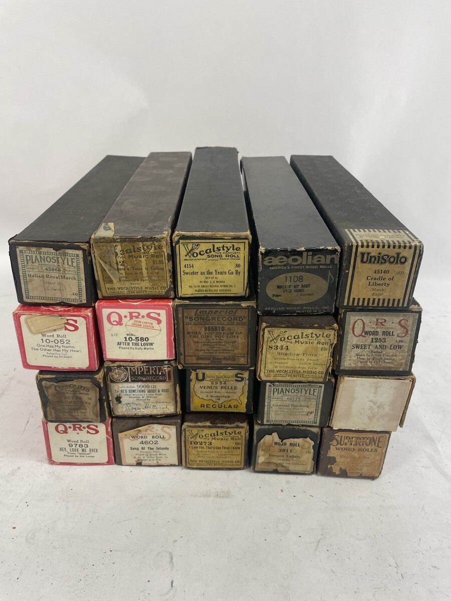 VINTAGE LOT OF 20 PLAYER PIANO ROLLS USED VARIOUS BRANDS AND SONGS SEE PICTURES FOR CONDITION - UNTESTED DUE TO NO PIANO TO TRY THEM ON - THESE ARE FROM AN OLD HOUSE I HAD BOXES SHOW WEAR Free shipping with FEDEX ground