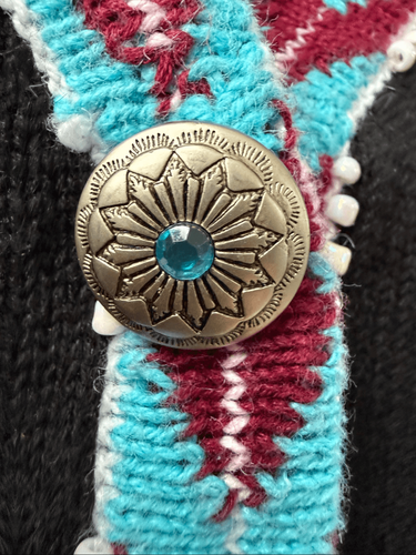 Storybook Knits Buffalo Night Western cardigan sweater. Double button closure. It buttons on the underside and the etched silver tone buttons on the exterior with topaz color rhinestone in the center are decorative. Applique and embroidered horses, bull, beadwork and trim in burgundy, turquoise, green, beige and white on black background. Cotton Ramie blend. No noted flaws. Bring flat measures 21 inches shoulder to ham and 27 inches armpit to armpit.