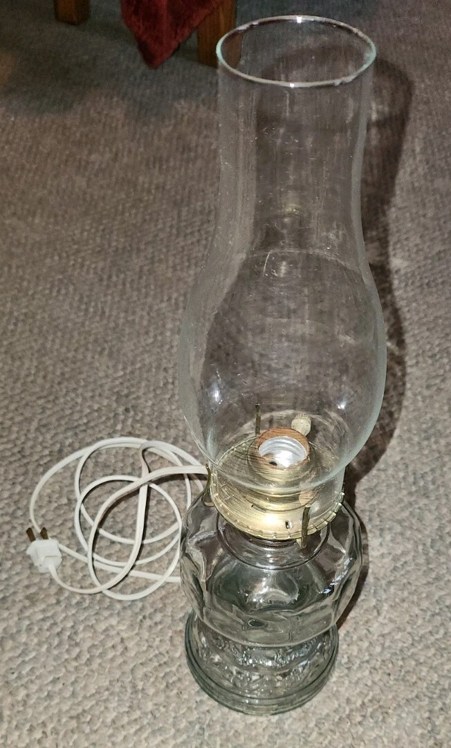 Good condition vintage oil hurricane lamp. Converted to electric. Could be made to burn oil again if you wanted. Clear glass. Measures 16.5 inches tall. Will not be shipped with a light bulb.
