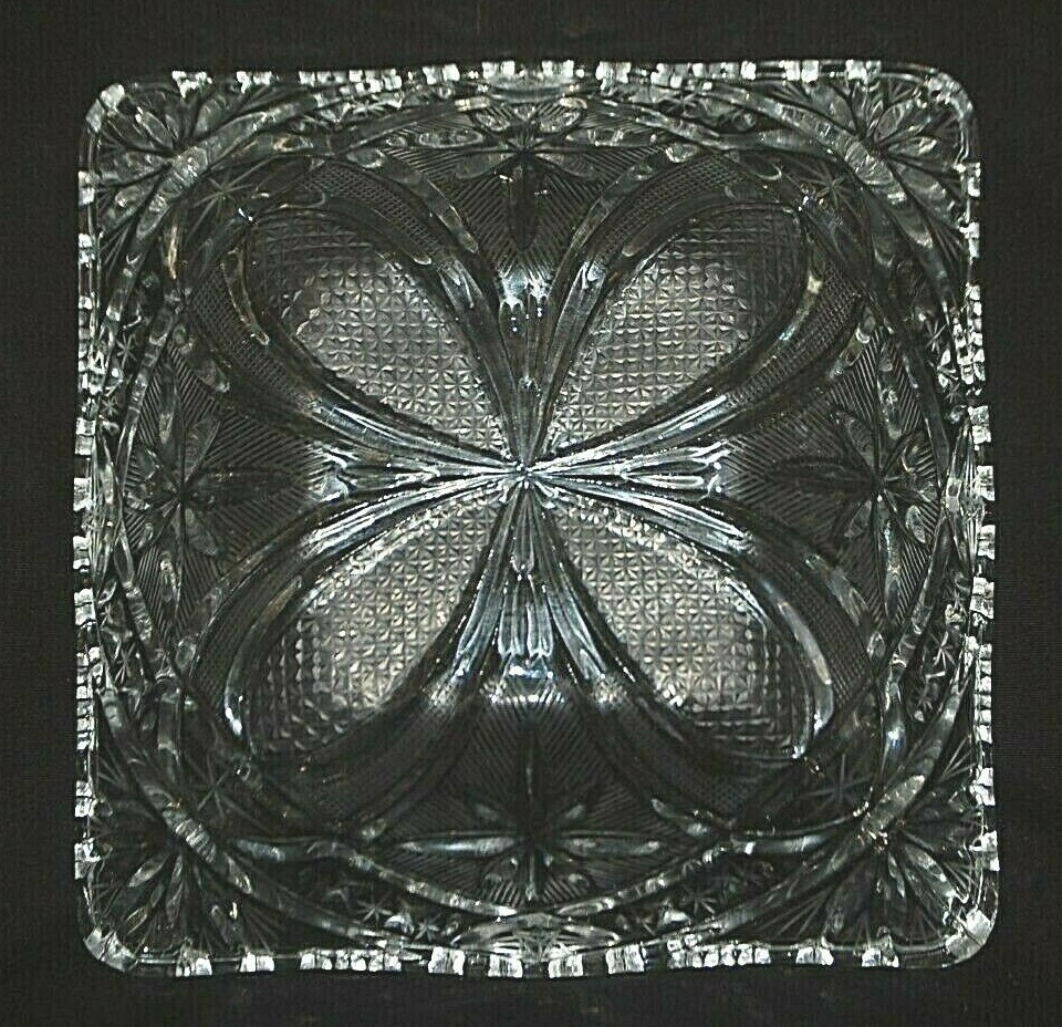 Ornate Square Crystal Bowl Stars Loops 5 Point Fan Fine Cut Accents Sawtooth Rim