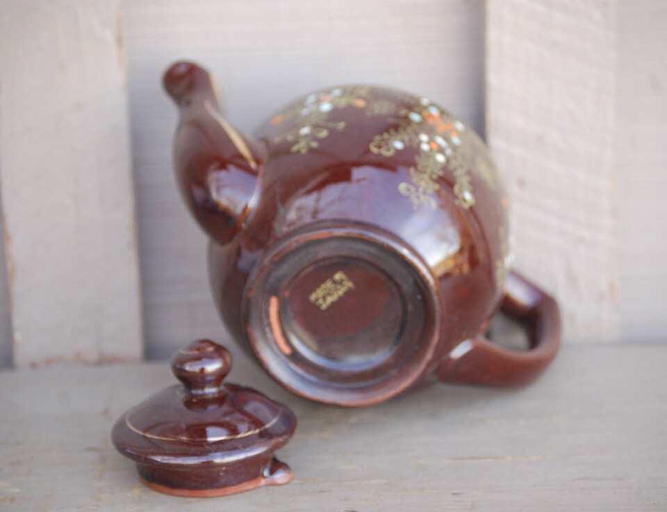 Handpainted Redware Teapot Brown Glaze Gold Highlights Japan b