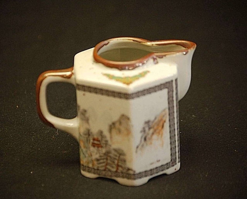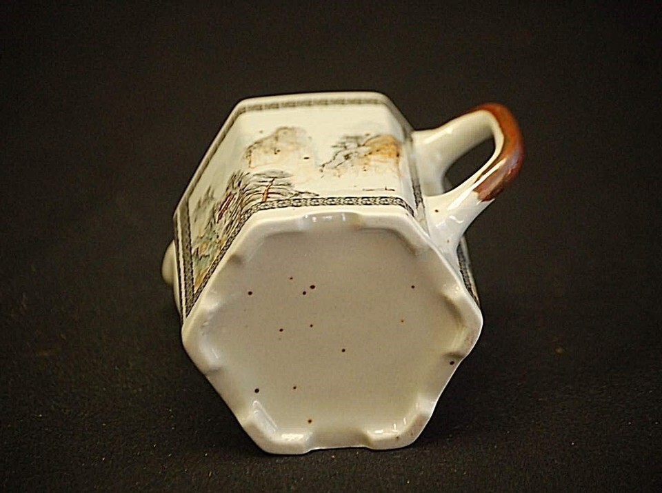 Old Vintage Japanese Milk Creamer Pitcher w Village Scene Hexagon Shaped