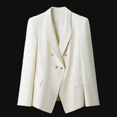 Double breasted shoulder pad blazer in ecru with a notched lapel collar.