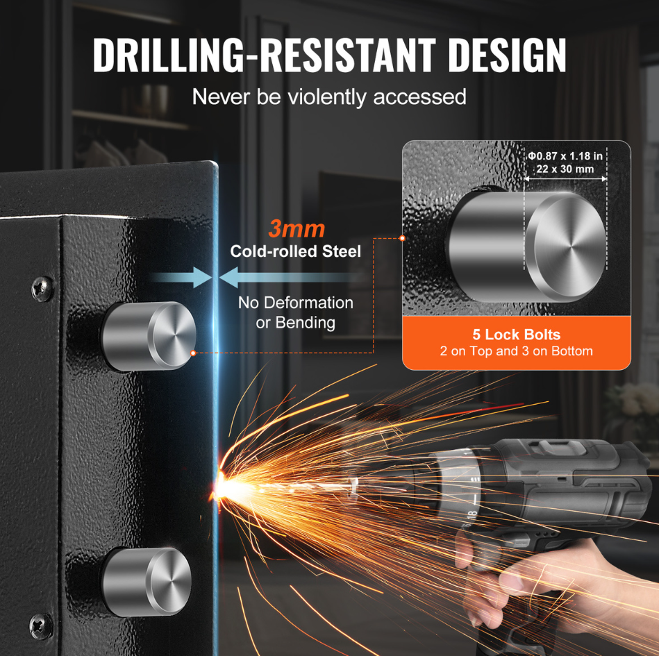 Maximum Protection: The safe box is made from high-quality alloy steel with a 3mm thick door plate to ensure maximum security. Equipped with 6 solid door bolts, it provides superior protection against any attempted break-ins.