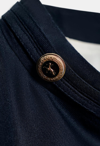 Golden button tailored blazer in navy blue with a high neck.