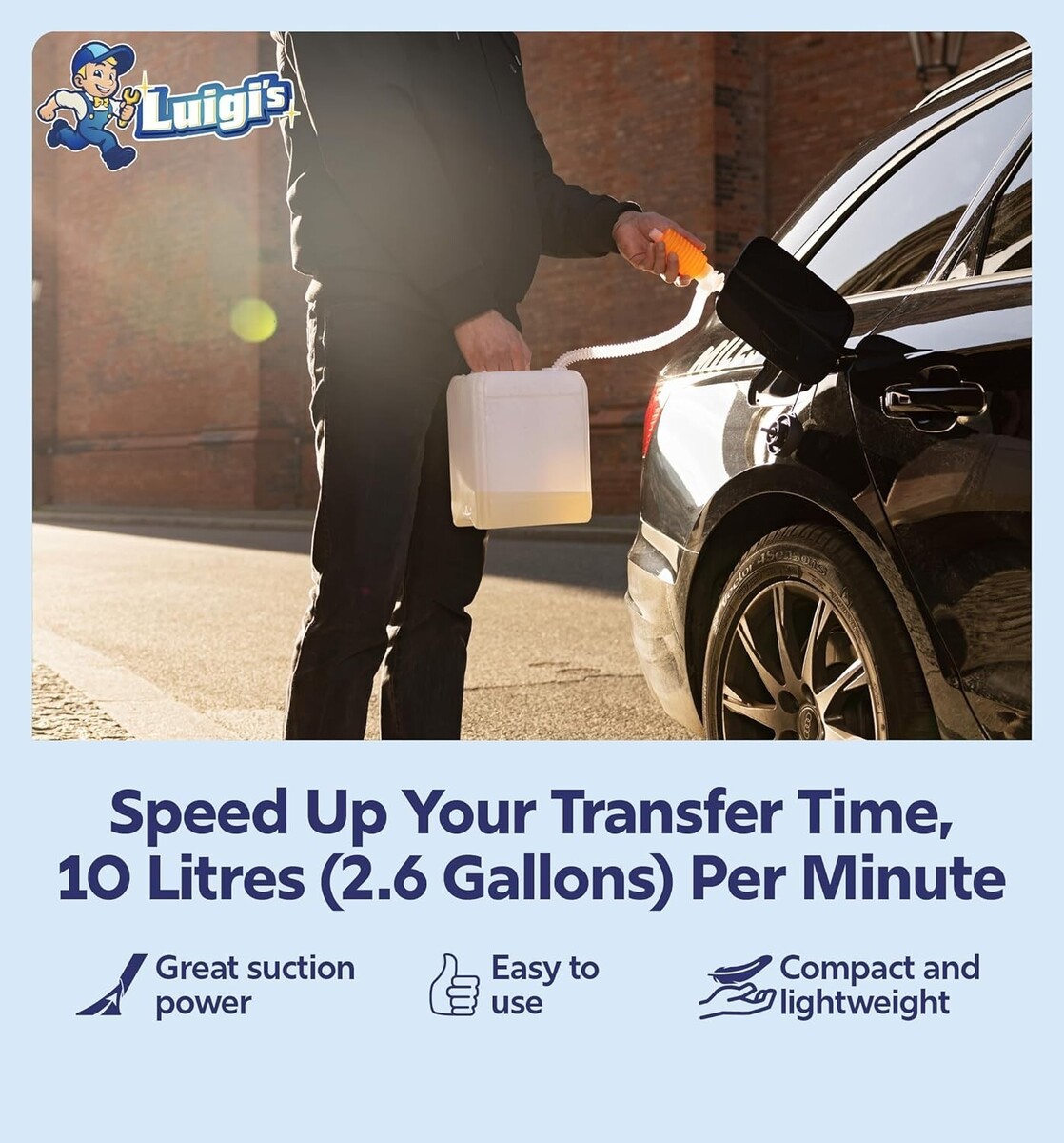 Flow rate of approximately 10 liters per minute for swift liquid transfer.