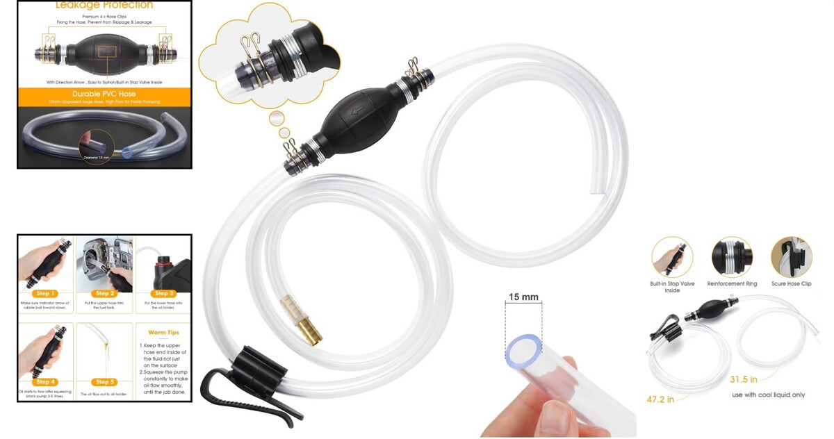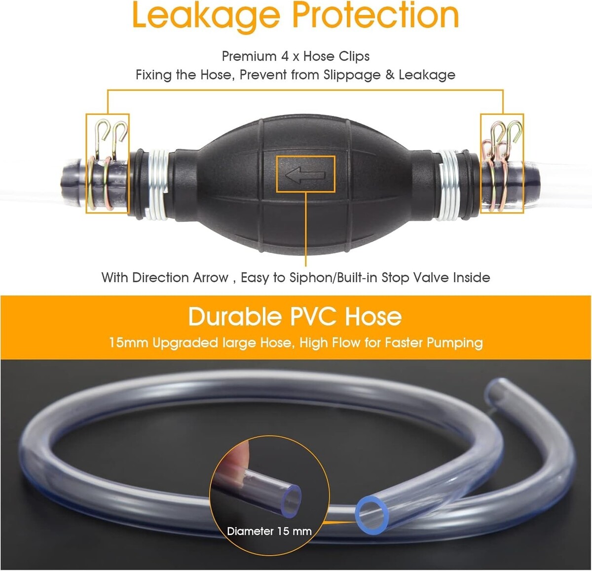 Faster and Efficient Pumping: Upgraded Dia 15mm hoses ensure faster and easier fluid transfer, paired with a black siphon bulb featuring a built-in one-way stop valve to prevent backflow.