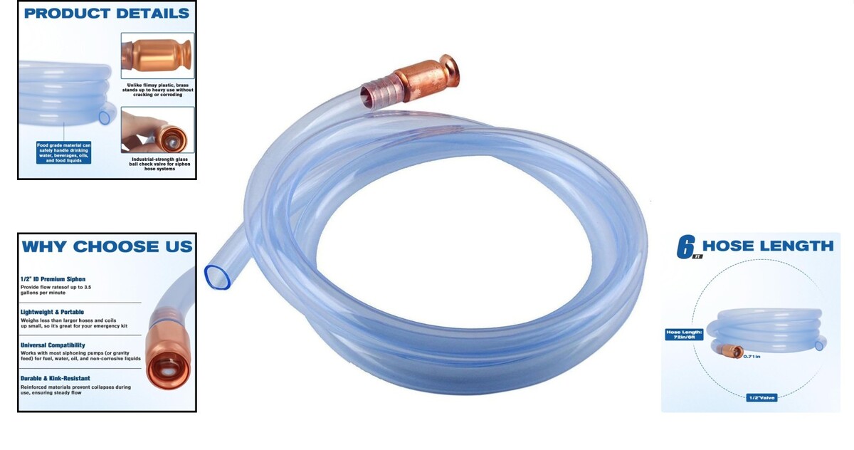 Your ideal solution for quick and hassle-free fuel and water transfer! This 6-foot siphon hose combines functionality with safety, making it a must-have for emergency preparedness and everyday liquid transfer needs.