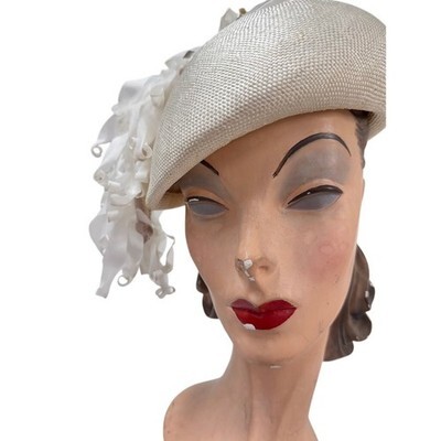This exquisite 1950s white straw cocktail hat is a study in elegance and sculptural millinery design. The structured pillbox silhouette is dramatically accented with a cascade of soft curled ribbon loops, creating a look that blends Parisian sophistication, Grace Kelly bridal poise, and classic midcentury cocktail glamour. It?s the perfect finishing touch for bridal styling, vintage garden parties, or couture costuming.