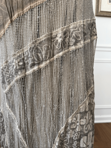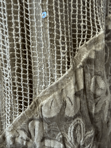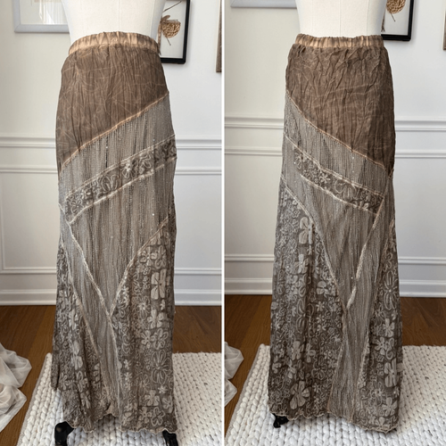 Chico?s Boho Crinkle Mesh Fairy Grunge Skirt Burnout Floral Maxi Lagenlook. Elastic waist. Lined. The color is a mix of taupe and sage green. Burn out floral, mesh, crinkle fabric, and sporadic iridescent sequence on the mesh. Laying flat measure 16.5 inches straight across the waist and 36 inches long Chico?s size 2, which is proprietary sizing that is roughly equivalent to a US women?s size large or 12.