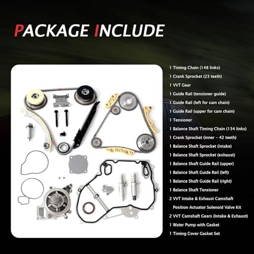 ?Vehicle Fitment?: 2010 Buick Lacrosse 2.4L, 2011-2013 Buick Regal 2.0L, 2013-2016 Buick Verano 2.0L, 2008-2010 Chevrolet Cobalt 2.0L, 2010 Chevrolet Equinox 2.4L, 2008-2010 Chevrolet HHR 2.0L, 2006-2011 Chevrolet HHR 2.4L, 2008-2012 Chevrolet Malibu 2.4L, 2010 GMC Terrain 2.4L ?Vehicle Fitment?: 2007 Pontiac G5 2.4L, 2006-2010 Pontiac G6 2.4L, 2007-2009 Pontiac Solstice 2.0L, 2006-2009 Pontiac Solstice 2.4L, 2007-2009 Saturn Aura 2.4L, 2006-2007 Saturn Ion 2.4L, 2007-2010 Saturn Sky 2.0L/2.4L, 2008-2010 Saturn Vue 2.4L ?Part Number?: Timing Chain Kit: 9-4201SA, 90537388, 12577163, 24424758, 90537435, 90537295, 13104978, 90537633, 12588387, 90537337, 917-270, 12578515, 917-254, 12621505, 12578516; Water pump: 1307350, 93195308, 93181118, 93178602, 89036356, 71751273, 71739401, 55352570, 24467301, 24461382, 24439798, 1334083, 1334067, 12630084, 12624936, 12621284, 12591894, 12585226; Actuator Solenoid : 917-216, 917216, 12679100, 12655421, 12646784, 12628348, 12578518, 917-215, 917215, 12679099, 12655420, 12646783, 12628347; Timing Cover Gasket Set: 24435052 TCS46079 ?Feature?: Timing Chain Kit has stable and reliable transmission, which can solve the problems of abnormal noise and car failure to start. This engine timing chain kit with water pump and VCT solenoid actuator is made of high-quality materials to maintain engine power and acceleration, ensuring your car stays in great condition. The kit, designed for 2.4L and 2.0L engines,is easy to install and comes with complete accessories, saving you time ?Package Includes?: 1 Timing Chain (148 links), 1 Crank Sprocket (23 teeth), 1 VVT Gear, 1 Guide Rail (tensioner guide), 1 Guide Rail (left for cam chain), 1 Guide Rail (upper for cam chain), 1 Tensioner, 1 Balance Shaft Timing Chain (134 links), 1 Crank Sprocket (inner - 42 teeth), 1 Balance Shaft Sprocket (intake), 1 Balance Shaft Sprocket (exhaust), 1 Balance Shaft Guide Rail (upper), 1 Balance Shaft Guide Rail (left), 1 Balance Shaft Guide Rail (right), 1 Balance Shaft Tensioner, 2 VVT Intake Exhaust Camshaft Position Actuator Solenoid, 2 VVT Camshaft Gears (Intake Exhaust), 1 Water Pump with Gasket, 1 Timing Cover Gasket Set ?Note?: This timing chain kit came with one Intake one Exhaust Cam Gears; Please carefully check the part number and model information before purchasing to prevent purchasing errors, wasting time and money