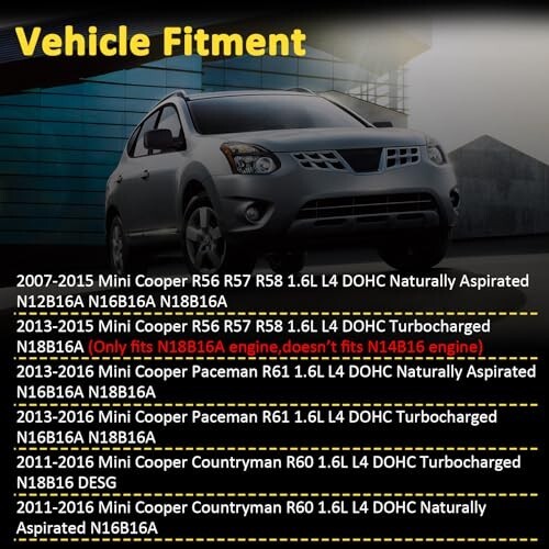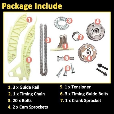 Engine code: N12B16A, N16B16A, N18B16A 1.6L L4 Naturally Aspirated Turbocharged DOHC Package include: 1 Timing Chain, 1 Tensioner, 3 Guide Rail, 2 Cam Sprockets, 1 Crank Sprocket, 3 Timing Guide Bolts, 20 Bolts Replace part number: 11367545862, 11367536085, 11310150552, 11311439853, 11217588996, 11317607551, 11317533879, 11317533880, 11317577301, 11317552106, 11317577631 Compatible with: Fit 2007-2015 for Mini Cooper R56 R57 R58 DOHC N/A N12B16A N16B16A N18B16A, fit 2013-2015 for Mini Cooper R56 R57 R58 DOHC Turbo N18B16A, fit 2013-2016 for Mini Cooper Paceman R61 DOHC N/A N16B16A N18B16A Compatible with: Fit 2013-2016 for Mini Cooper Paceman R61 DOHC Turbo N16B16A N18B16A, fit 2011-2016 for Mini Cooper Countryman R60 DOHC N/A N16B16A, fit 2011-2016 for Mini Cooper Countryman R60 DOHC Turbo N18B16 DESG Customer Support: Customer satisfaction is our first priority. If there is any problem with the product, such as damage or not suitable for your car, please feel free to contact us, we will solve the problem for you within 24 hours