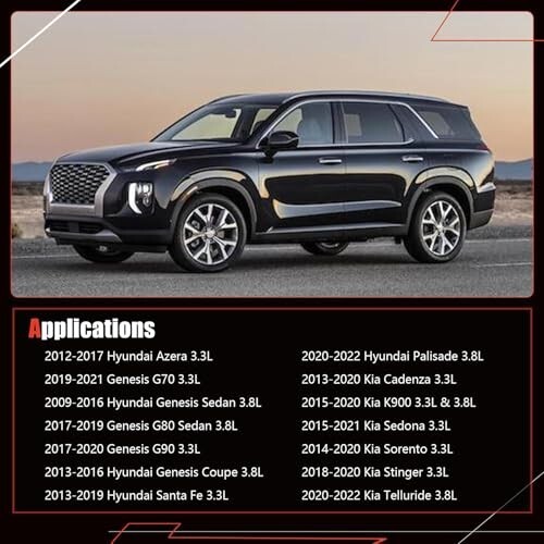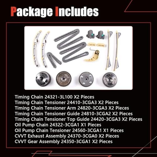 OE number:24410-3CGA3, 24820-3CGA3, 24810-3CGA2, 24321-3L100,243703CGA0,243503CGA0, 243503CGA1 Fits for Hyundai 3.3L 3.8L: 2012-2017 Hyundai Azera ,2019-2021 Hyundai Genesis G70, 2009-2016 Hyundai Genesis Sedan,2017-2019 Hyundai Genesis G80 Sedan,2017-2020 Hyundai Genesis G90,2013-2016 Hyundai Genesis Coupe,2013-2019 Hyundai Santa Fe,2020-2022 Hyundai Palisade Fits for Kia 3.3L 3.8L: 2013-2020 Kia Cadenza, 2015-2020 Kia K900 ,2015-2021 Kia Sedona ,2014-2020 Kia Sorento ,2018-2020 Kia Stinger ,2020-2022 Kia Telluride Package Includes: Timing Chain 2 Pieces, Timing Chain Tensioner 2 Pieces,Timing Chain Tensioner Arm 2 Pieces, Timing Chain Tensioner Guide 2 Pieces, Timing Chain Tensioner Top Guide 2 Pieces, Oil Pump Chain 1 Pieces;Oil Pump Chain Tensioner 1 Pieces;CVVT Exhaust Assembly 2 Pieces;CVVT Gear Assembly 2 Pieces Excellent service: We focus on building our brand, so we pay attention to quality and customer service. If you have any questions about our products, please contact our customer service team, we will solve your problems at any time