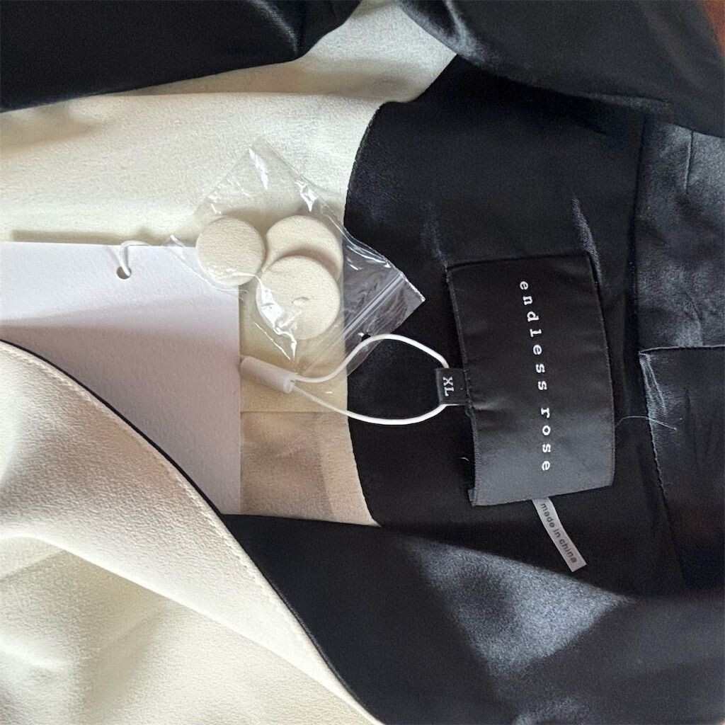 The Endless Rose blazer in size XL is crafted from polyester with a viscose and polyester lining. It features a solid ivory color with satin-like lapels and pocket details, accented by buttons. Designed for women, this long-sleeve, long-length basic jacket is suitable for formal occasions, offering a sophisticated look. Although a button is missing, extra buttons are included. The blazer requires dry cleaning. New with tags. Keywords: Endless Rose, blazer, women's jacket, ivory blazer, formal wear, polyester, viscose lining, long sleeve, sophisticated, extra buttons, dry clean, size XL, formal occasion, button accents, satin lapels.