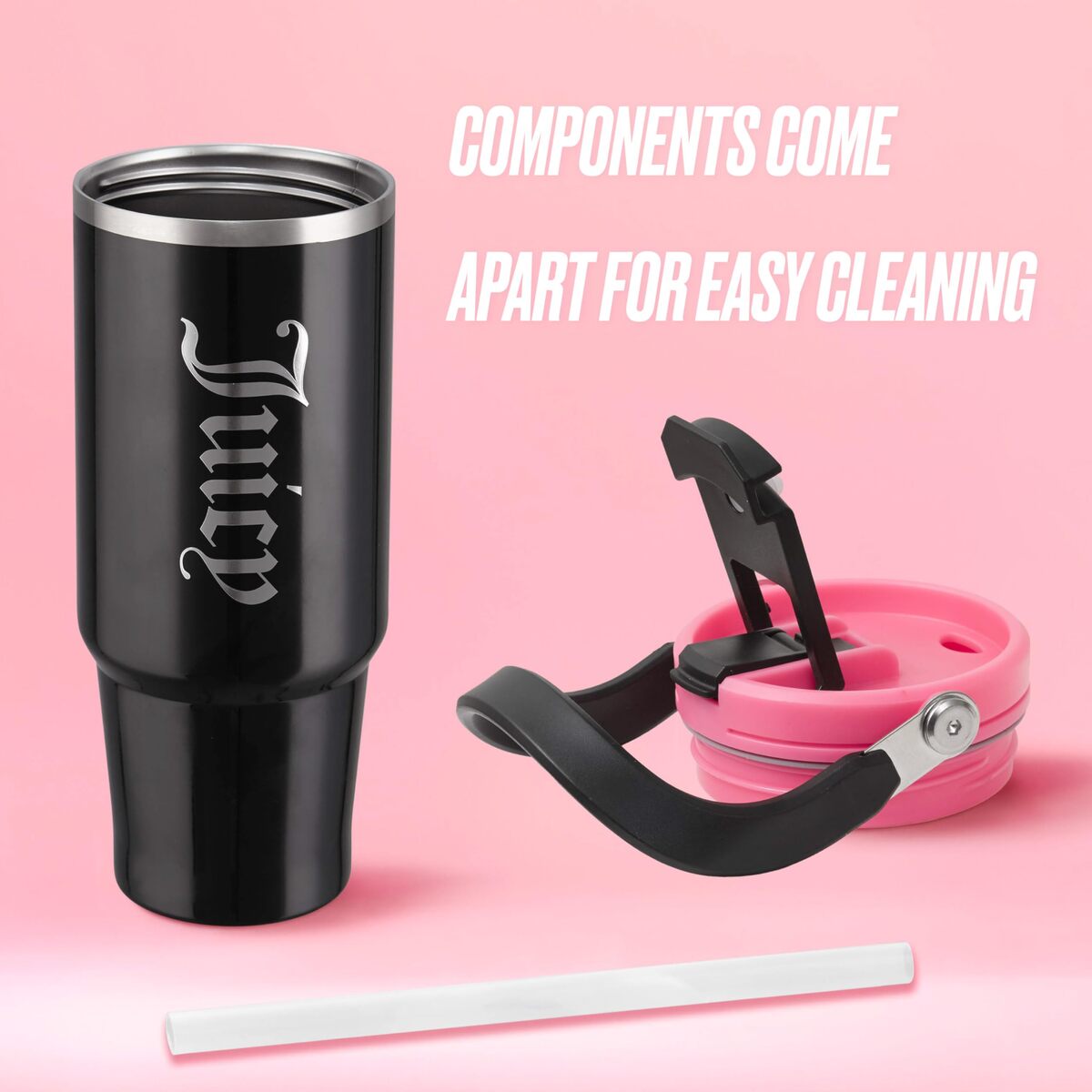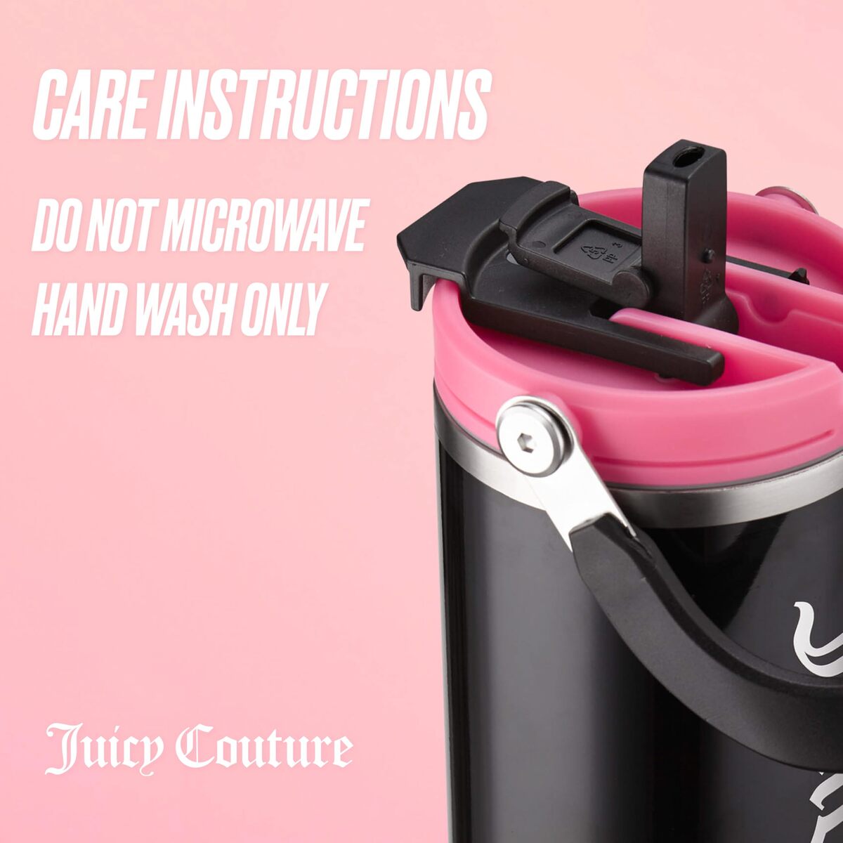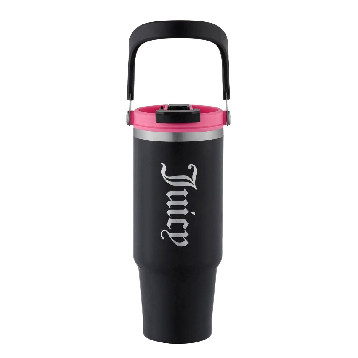 The Juicy Couture Flip Fusion Hydration Tumbler combines style and function in a bold 40oz design. Crafted with double-walled stainless steel, it helps maintain drink temperature while a stainless steel carrying handle with a plastic grip ensures comfortable, easy transport. Designed to fit in most cup holders, this chic tumbler is perfect for staying hydrated on the go.