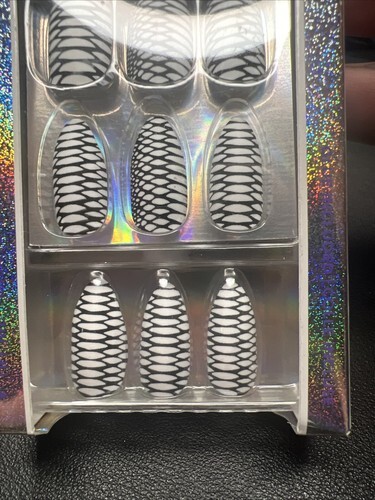 24pc Claire?s Fake False Glue On Black White Fishnet Matte Medium Almond Nails