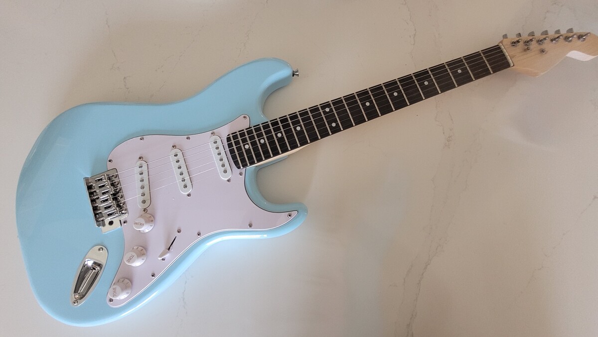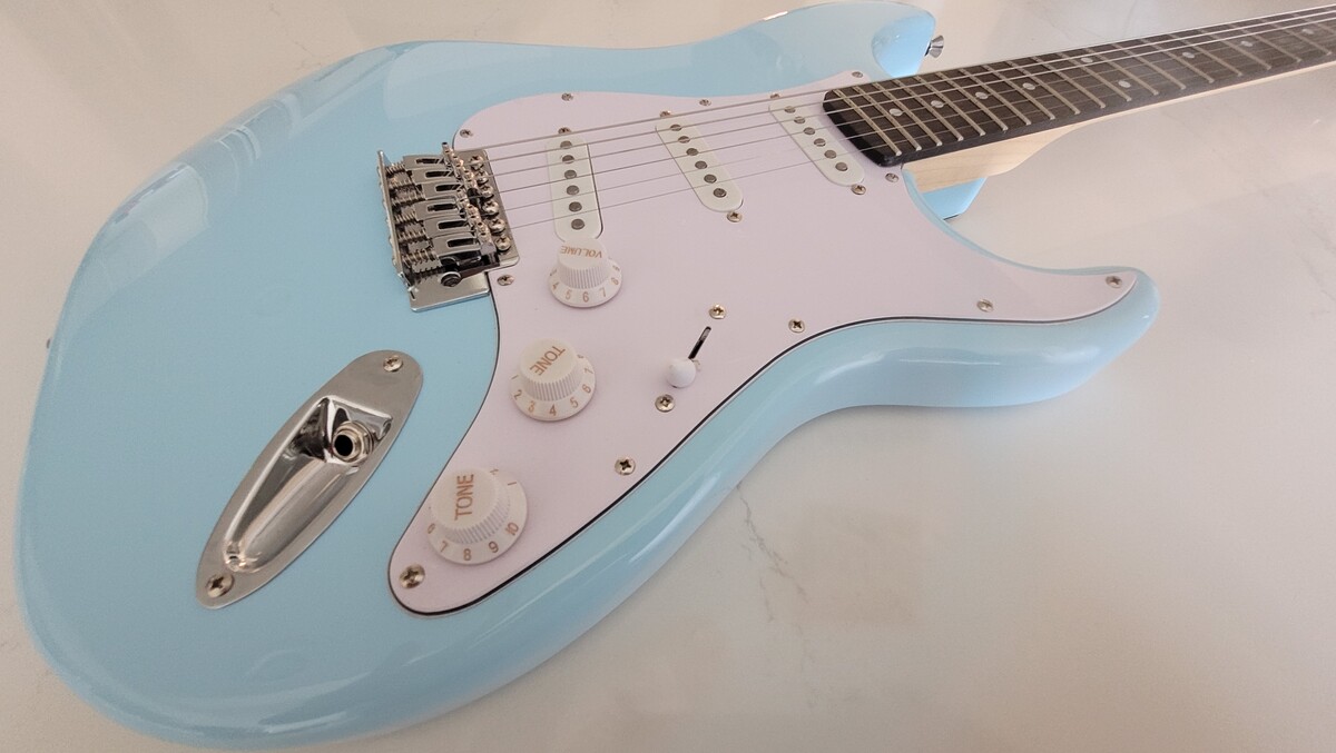 Partscaster guitar in a Baby Blue Finish.
