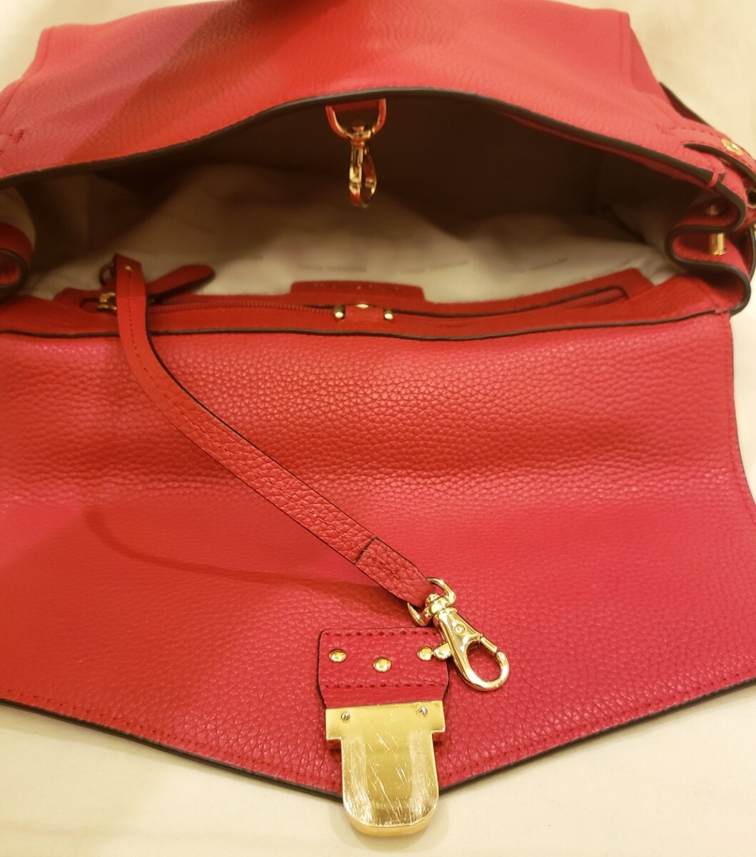 all your essentials. It's crafted of red pebbled leather, which is highly scratch-resistant,