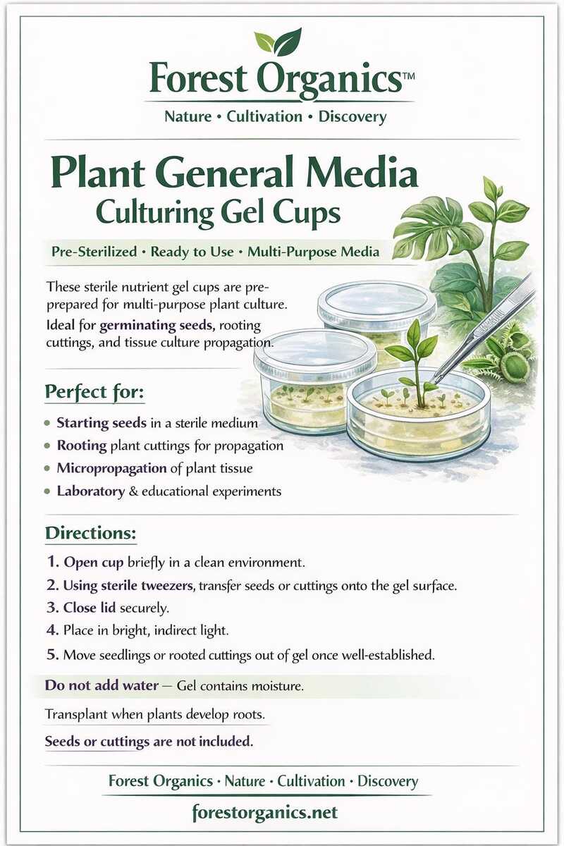 The medium comes pre-mixed and sterilized, eliminating preparation hassles and reducing contamination risks. Whether you're working on plant cloning, gene pool conservation, or studying endangered species, these culturing gel cups offer a professional-grade solution for your tissue culture needs.
