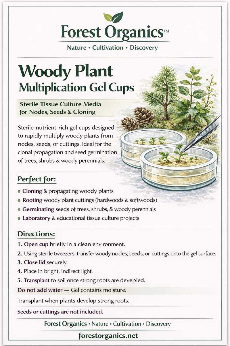 For best results, pair with our Tissue Culture Transfer Kit A high-vigor multiplication medium formulated for fast-growing woody and specialty ornamental species. Each cup contains a pre-sterilized nutrient gel designed to support rapid node development, strong cell division, and consistent micropropagation results.