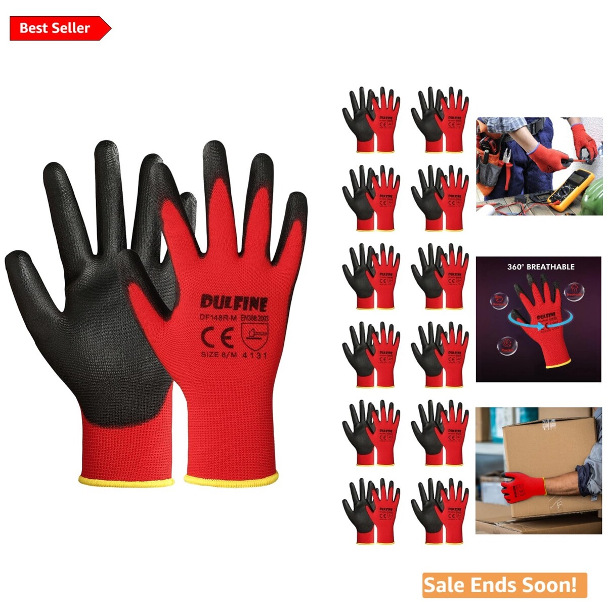 12 Pairs PU Coated Safety Work Gloves in Red