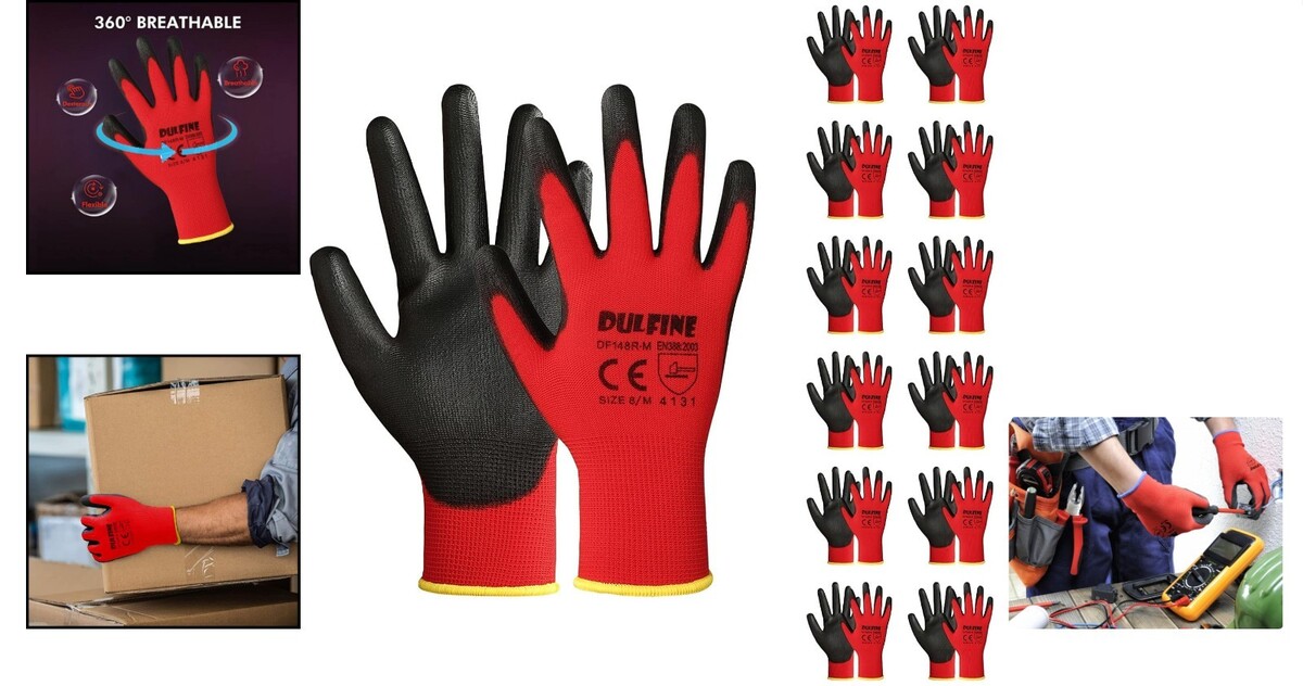12 Pairs PU Coated Safety Work Gloves in Red and similar items