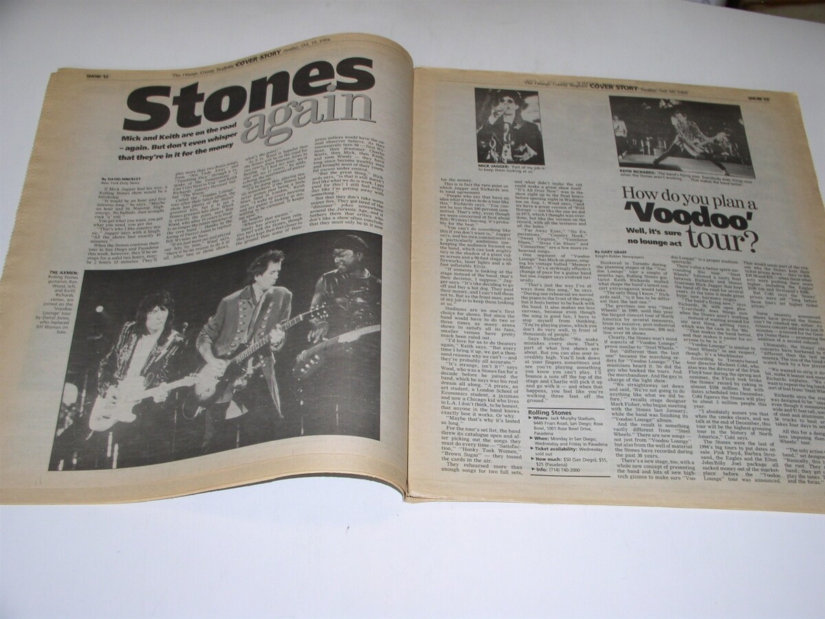 This is the October 16, 1994 issue of "Show" newspaper supplement. Cover story on The Rollin Stones Voodoo Lounge tour. Concert preview. Pictured on cover: Mick Jagger and Keith Richards. A great item for the fan or collector.