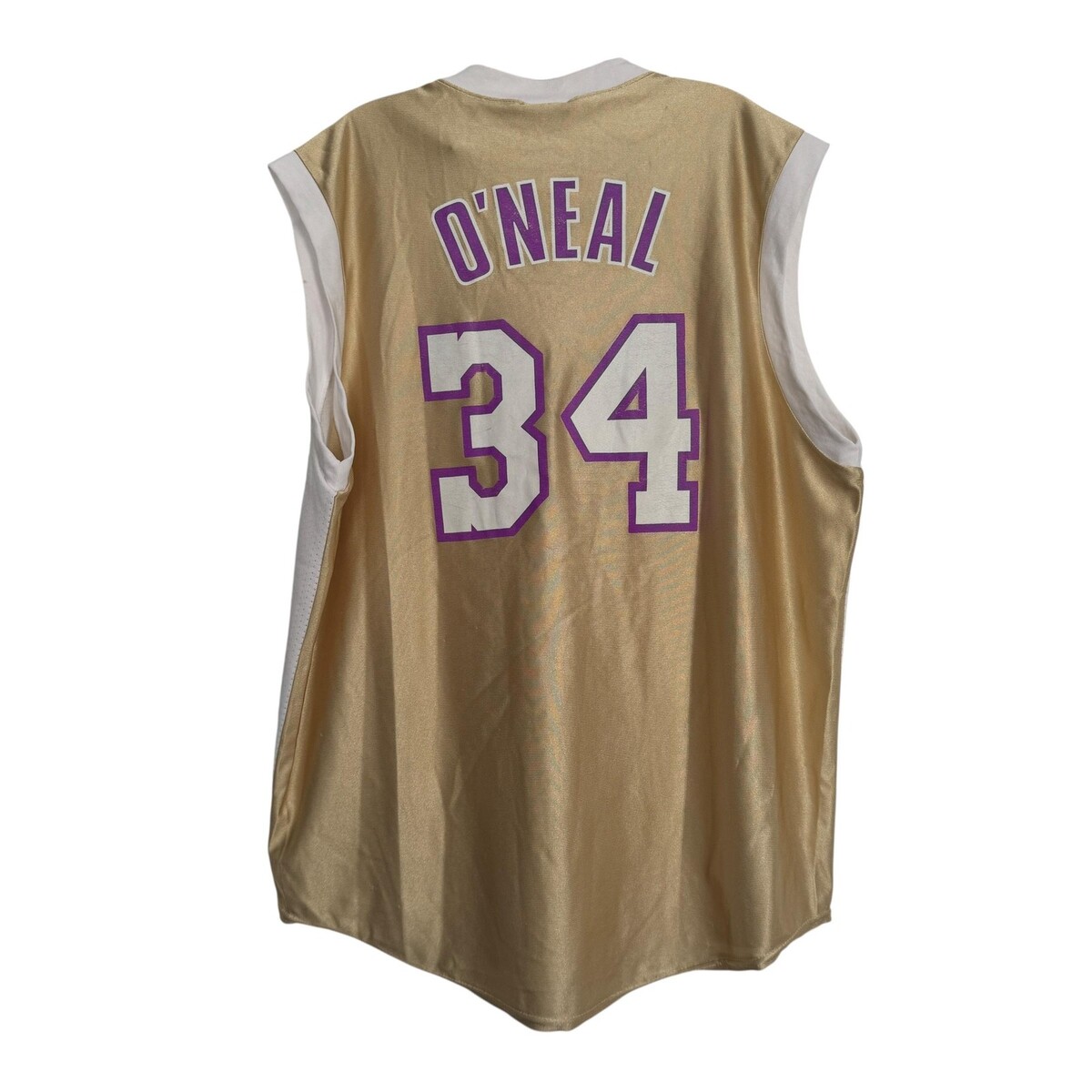 Back of jersey displays arched O'Neal name and oversized 34 numerals in white with purple outline on the gold panel.