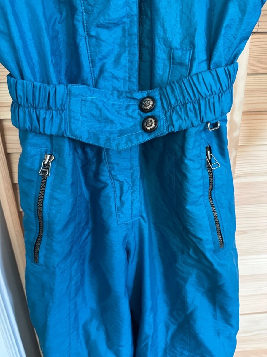 Retro one-piece ski suit in vibrant teal. Front zip and snap button accents. Elasticized waist and cuffs for a fitted look. Zippered front pockets. Bold teal color throughout.