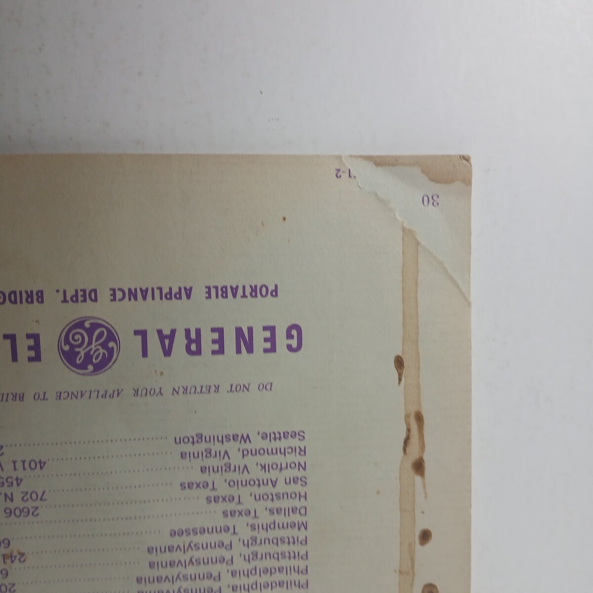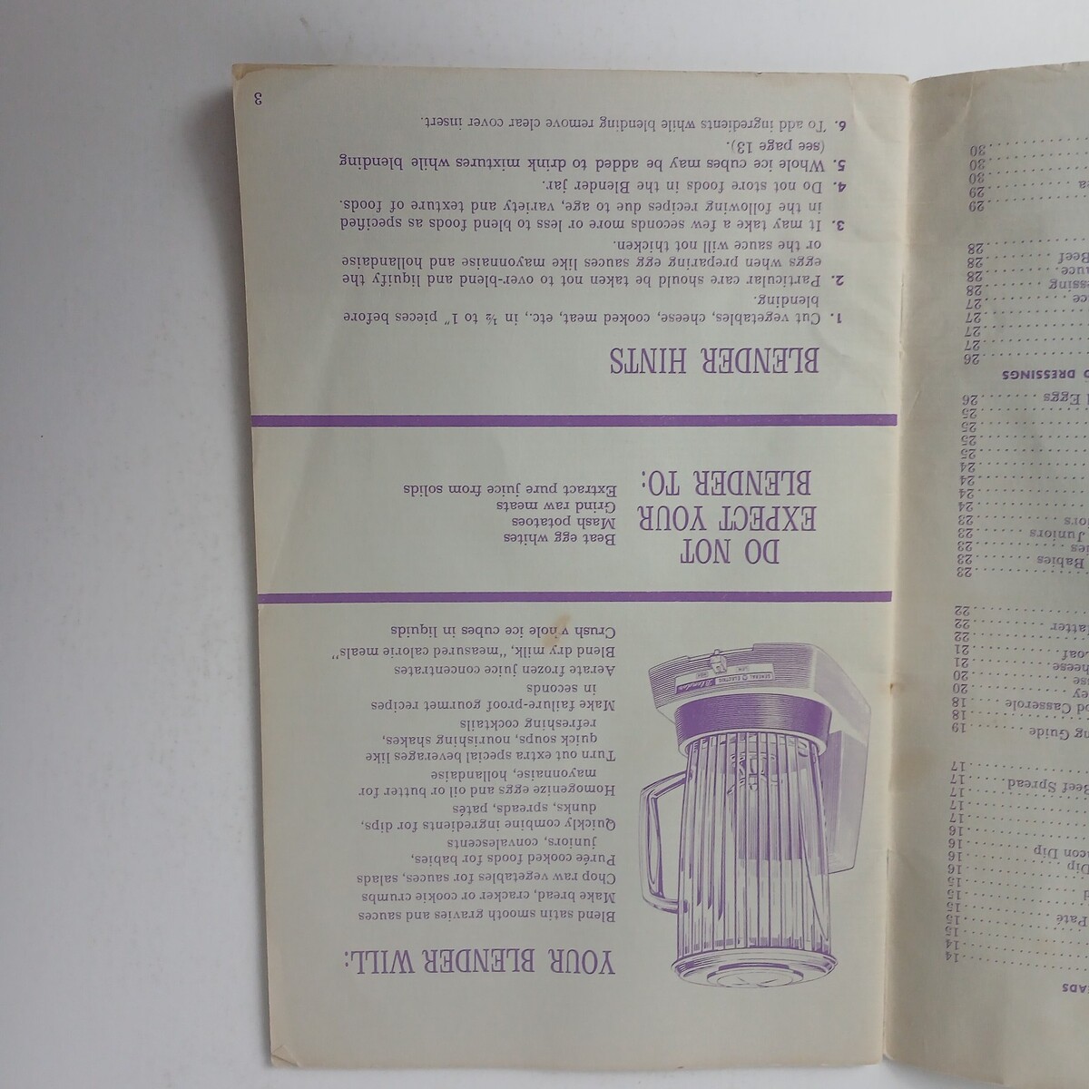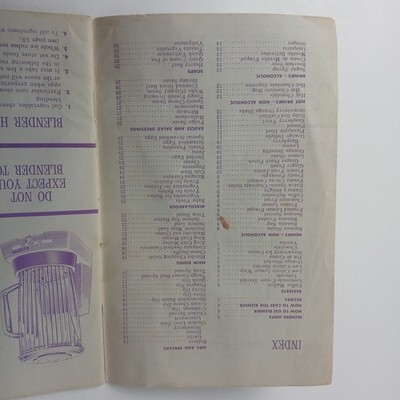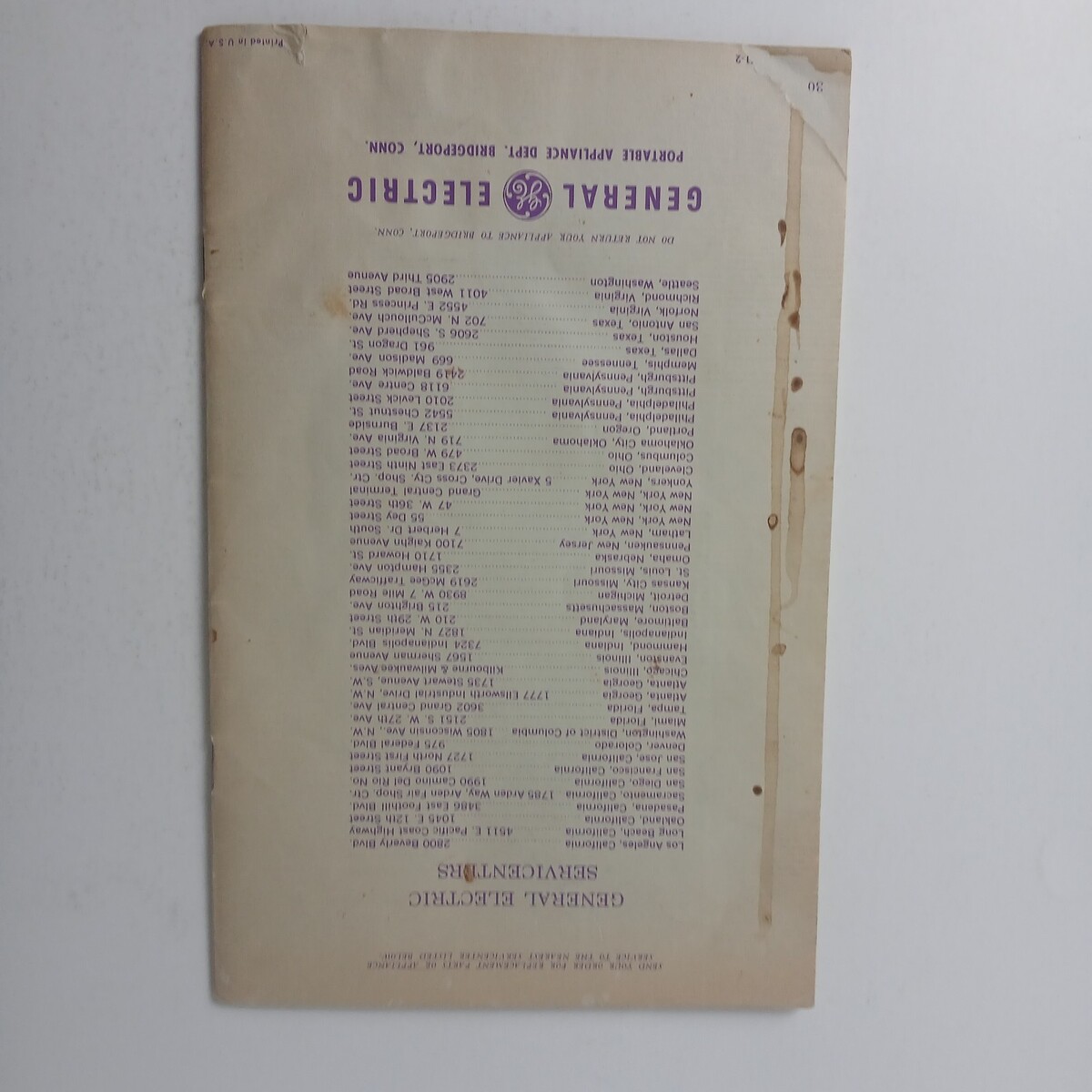 This listing is for an original "Use and care book" for a 1960's era General Electric Blender. This book contains use and care instructions for the General Electric Model BL-1 blender. It also contains numerous recipes that can made using the blender. The book is in acceptable condition. There are some minor water stains on the cover, and the bottom corner of the pages. The back cover has a small tear at the bottom and the bottom corner has been torn off. This listing is for the booklet only.
