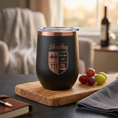 Authentic Irish Coat of Arms: Your family name and crest are laser etched to reveal a crisp stainless steel design. Black and Rose Finish: A modern color combination that highlights the traditional coat of arms. Temperature Control: Double wall vacuum insulation keeps drinks hot or cold 2X longer than standard glass or plastic. Durable and Travel Ready: Made from 18/8 Type 304 food grade stainless steel with a removable clear plastic lid. Perfect Size: 12 oz capacity; about 4.5 inches tall and 3.5 inches wide, comfortable to hold and fits most cup holders. Versatile Use: Great for wine, cocktails, iced drinks, coffee, tea, and more.