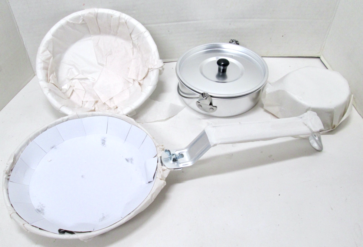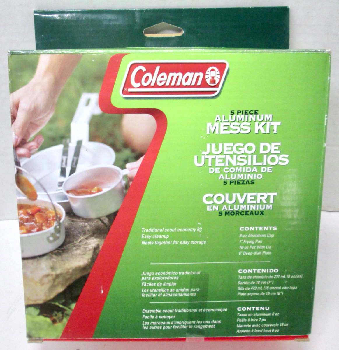 New Open Box Coleman, MESS KIT, 5 PIECE ALUMINUM, SCOUT KIT, EASY CLEANUP, EASY STORAGE. The lid of the pan has a few scratches from handling. The rest of the pieces are still wrapped in paper. Sold with free shipping.