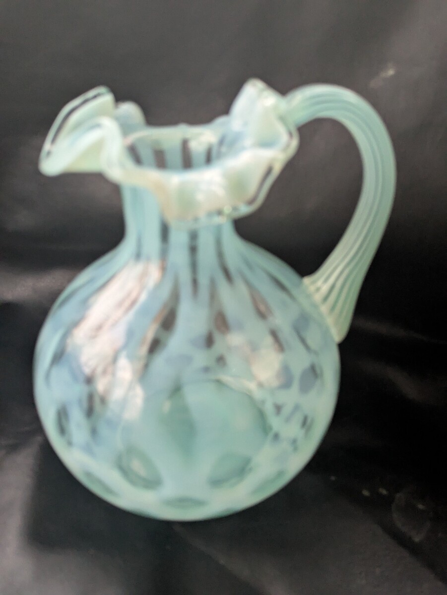 Le pichet Fenton Art Glass Blue Topaz Opalescent Coin Dot est une superbe piece de verrerie decorative mesurant 6,5 pouces de hauteur avec des levres ebouriffees. Fabrique en verre opalescent d'une belle couleur topaze bleue, ce pichet presente un motif classique a pois qui ajoute une touche d'elegance a tout decor d'interieur. Le style de production de verre d'art de Fenton ajoute une touche unique et artistique a cette piece de collection, ce qui en fait un ajout remarquable a toute collection de verrerie vintage.