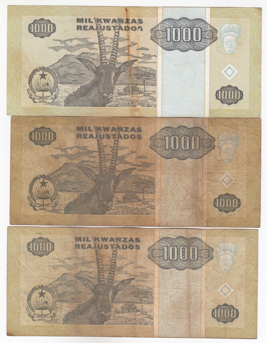 Angola, 1000 Kwanza, 1995, (lotto di 3) banconote del Banco Nacional De Angola,