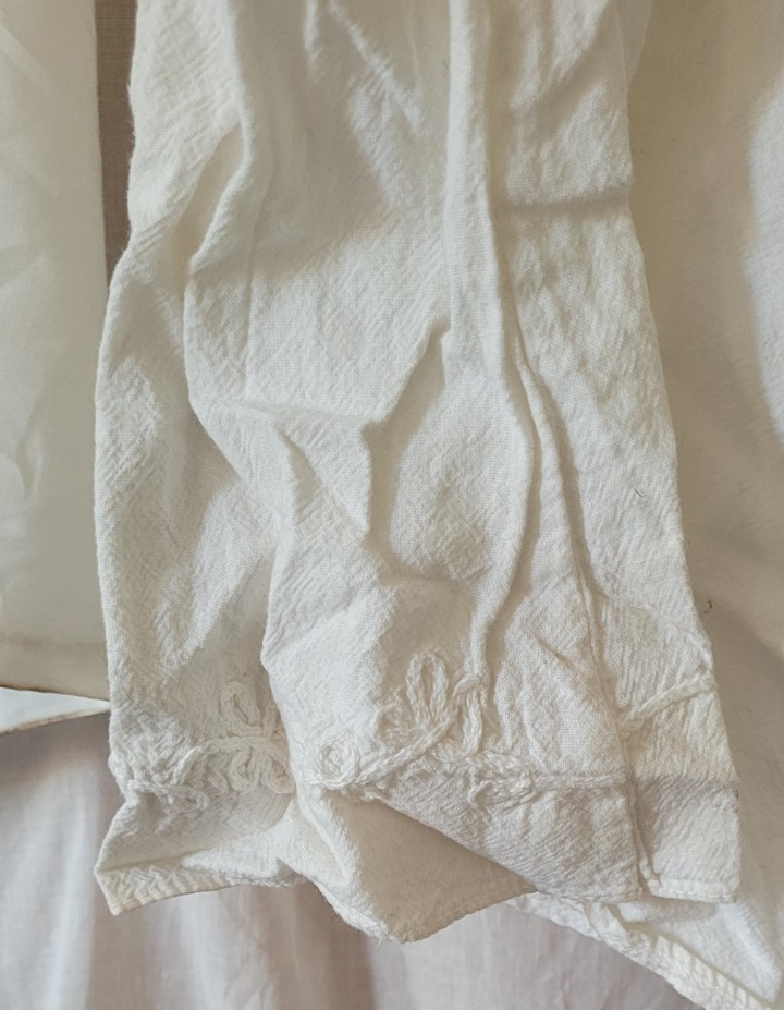 This shirt is in good used condition. As seen in the photos there are a few spots. It could be cleaned with a more aggressive cleaning. We don't do aggressive cleaning due to people having sensitive skin and allergies. There are no holes. The elastic works well. The size is unknown. Measurements are approximaely: Length: 18 inches. Pit to Pit: 20 inches. Sleeve: 22 inches.