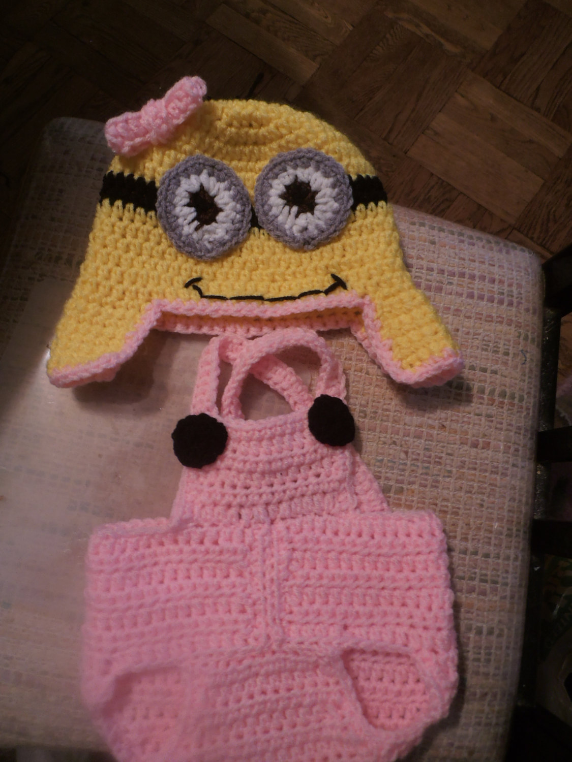hand crocheted yellow despicable character girl hat and diaper cover. With ear flaps and ties., or none, just email me for what you prefer. One or two eyes, you choose.This listing if for 0-3mth to 18mth, email me for larger size, even adult. Acrylic and cotton yarn. Fun for pics or any day. Original by me. 9-15 working days for delivery, email me for a rush Smoke free environment. Do not leave child unattended while wearing. Thanks!