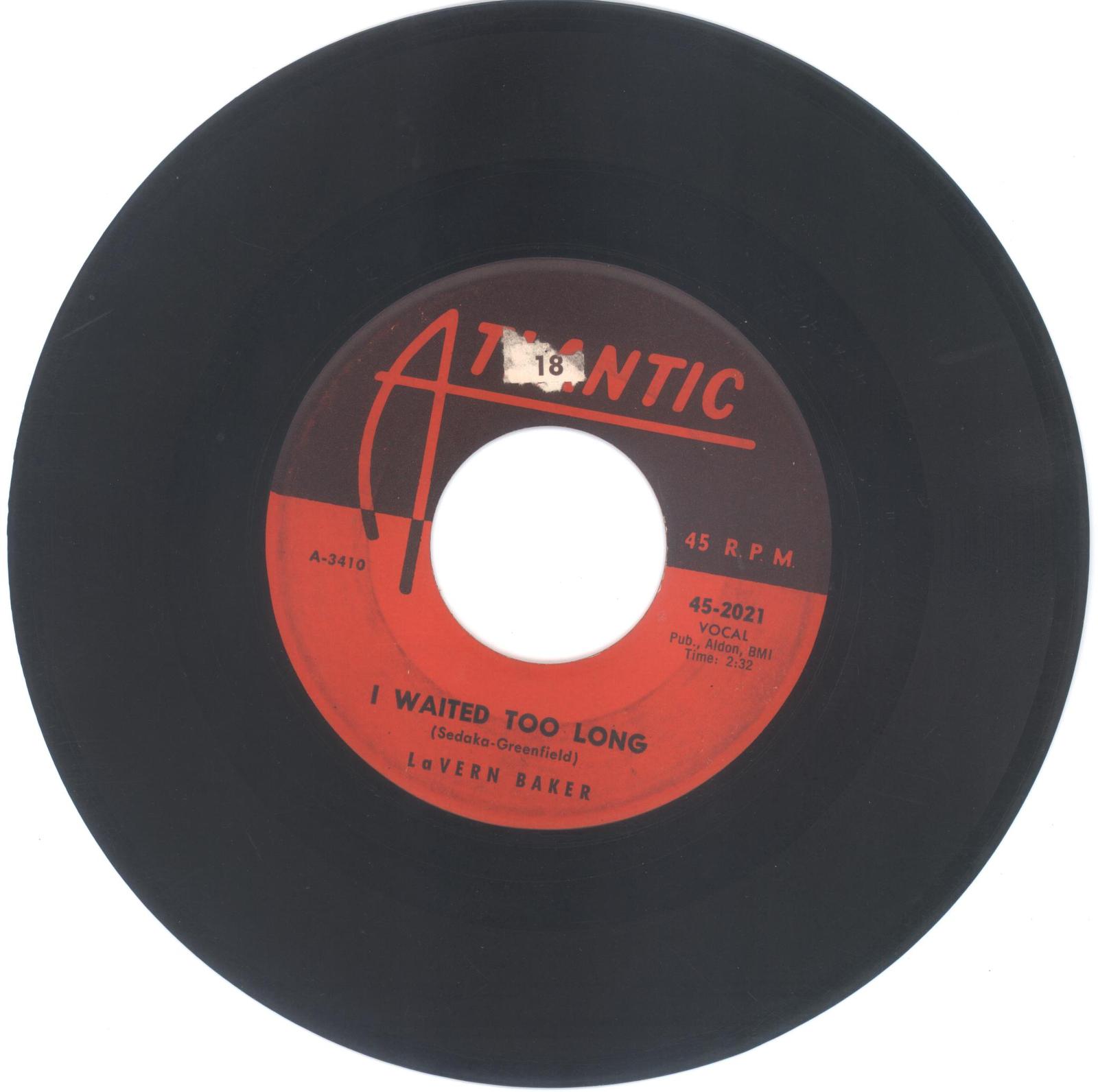 LaVern Baker 45 rpm I Waited Too Long b/w You're Teasing Me; Atlantic Records #2021; visually graded at vg- condition to g+, record has not been previewed, sticker on label.