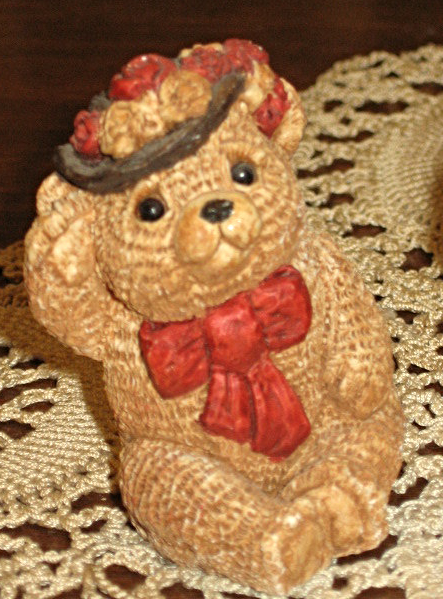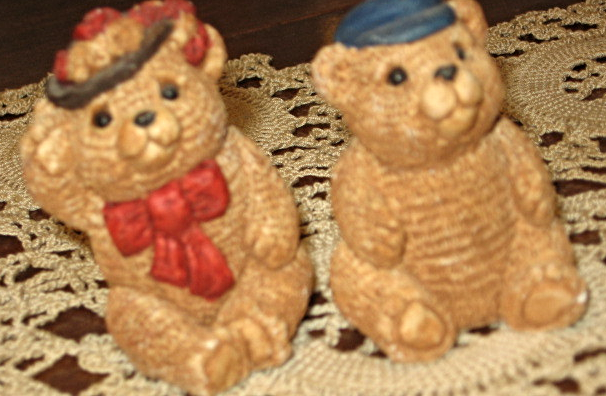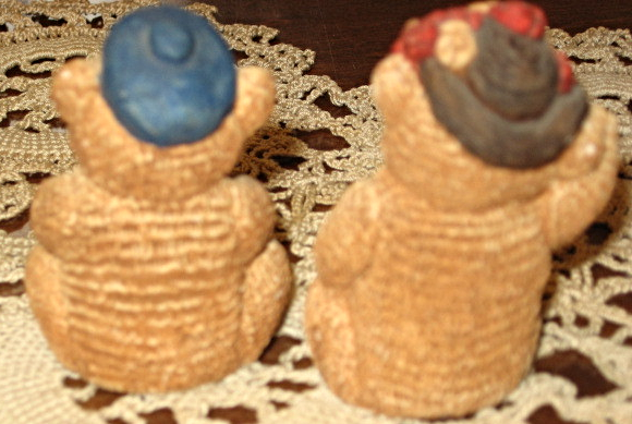This pair comes from the Stone Critters Littles Collection. Both figurines have the original sticker on the bottom of base. The girl Teddy has a stylish hat with red flowers and a matching bow at her neck. The boy Teddy has a blue cap tipped forward on his head. Each figure is 2" tall X 1" wide at the base. Sorry no boxes. Look for other Stone Critters in my booth.