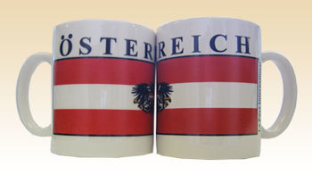 Our colorful 12 oz. ceramic Austria mug is perfect for your early morning beverage. The mug includes a unique wrap-around flag design that's visible from all sides. Microwave safe.Mugs are sold individually. They are pictured in pairs only to show the full design.