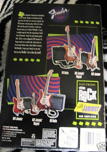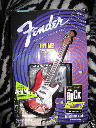 Never removed from box, highly detailed 1996 Tendmasters playable Stratocaster guitar with Fender amplifier and guitar stand toy. It should work, but can't be tested since it hasn't been removed from the box. The batteries must be dead, so I can't guarantee if it will work or not. I have been told by a collector that if you remove it from the box and put new batteries in it should work, as he did that with one of his. I didn't want to open the package.Beautiful candy apple red ten inch guitar. Box is in pretty good condition with a couple of small dents and a liitle price tag gum and some scuffs all around. Super kick-ass cool for a collector.