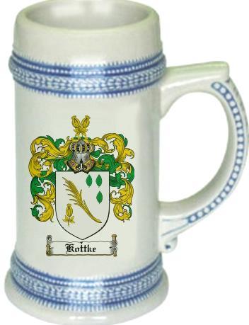 Kottke Family Crest Stein / Coat of Arms Beer Tankard. We believe our Coat of Arms Steins are of the highest quality anywhere. The glassware quality is very thick and sturdy. The stein feels great in your hand with a very thick handle. Fill this glass with your favorite beer or beverage. keywords: steins, beer, german, glass, glassware, cup, tankard, goblet, family shields, shield, family, genealogy, heraldry, code of arms